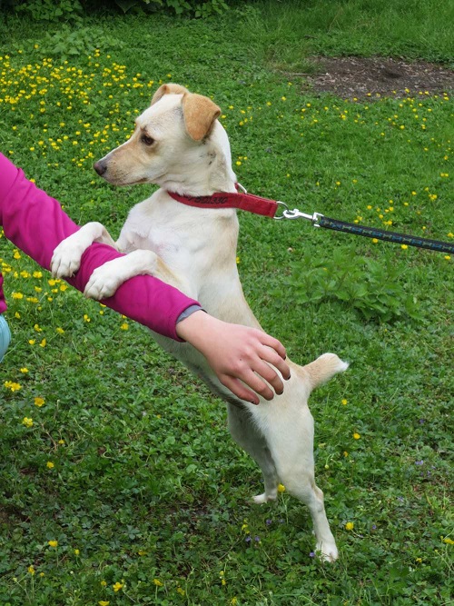 Sie geht freundlich auf Menschen zu und versteht sich bisher mit allen Hunden.